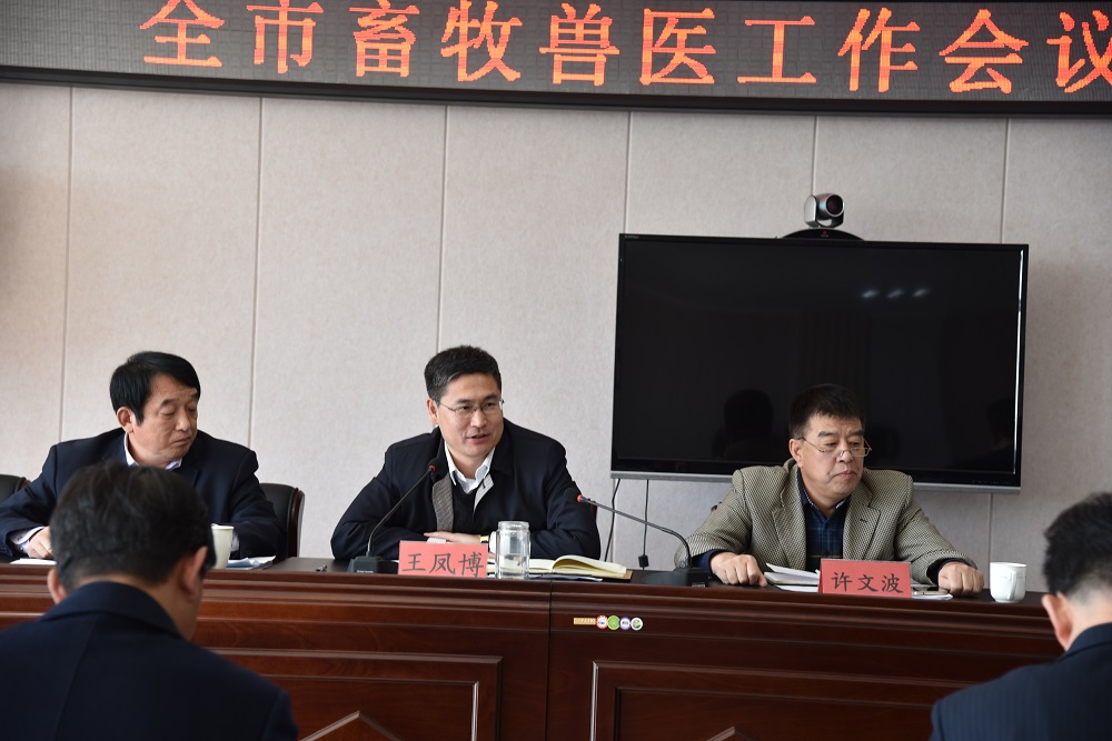 王凤博强调,2018年是贯彻党的十九大精神、实施乡村振兴战略的开局之年,是改革开放40周年,是实施“十三五”规划承上启下的关键一年,是畜牧千亿级产业集群创建的关键之年。全市畜牧兽医系统要以“产业兴旺、安全保障、生态美丽、作风过硬”为目标,全力实施“四大工程”:一是抓好千亿级产业集群打造工程。加快产业转型升级,促进畜牧业提质增效;拉长产业链条,加快三产融合发展;强化品牌意识,提高产品质量和市场竞争力;着力强化科技支撑,建立协同创新机制,构建稳定长效的产学研用合作机制;挖掘当地特色畜种资源,做大做强特色养殖。二是抓好安全保障工程。做好重大动物疫病防控工作,确保不发生重大疫情;加强畜产品质量安全监管力度,严厉打击非法经营使用违禁物品、畜禽私屠滥宰等危害畜产品质量安全的不法行为;强化畜牧生产安全行业监管力度。三是抓好生态畜牧业建设工程。确保畜禽规模养殖场废弃物处理利用设施配建率达到100%;稳步推进“粮改饲”,发展现代草业;树立种养结合、农牧循环发展理念,统筹考虑种养规模和环境消纳能力,积极开展种养结合循环农业试点示范和畜禽养殖标准化示范创建。四是抓好自身建设工程。深入贯彻全面从严治党各项要求,加强党风廉政建设和行风建设,驰而不息纠“四风”;在市局机关开展作风整治提升年活动;进一步提高依法行政能力和水平。规范畜牧执法,加强畜牧业生产全过程监管力度,压实责任,确保监管无死角;严格项目监督管理工作;做好扶贫攻坚、安全生产、信访稳定等工作,以高度的政治责任感和严实的措施确保不出问题;做好宣传引导,为畜牧干部职工树立良好社会形象。